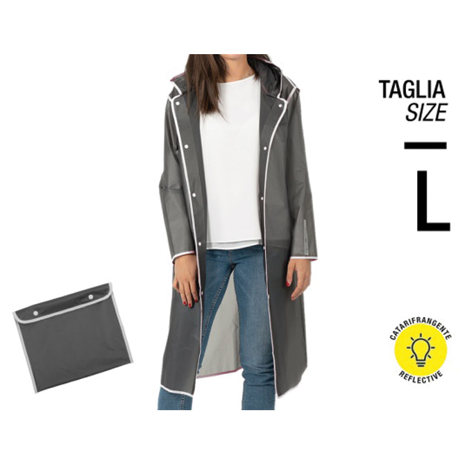 KABANICA Marka: PERLETTI Detalji: L;siva, reflektirajući rub, kopčanje – bijeli gumbi, kapuljača, kvalitetan EVA ( Etilenvinil acetat) materijal, pakranje u torbici, lagana, mekana, vodootporna SKU: 000060856