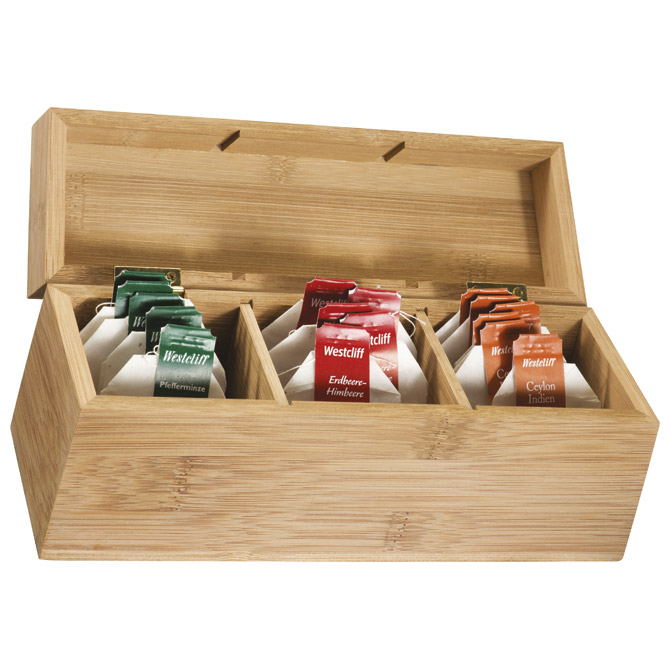 Detalji: 3318;3 odjeljka; u svaki odjeljak stane 10 vrećica čaja; dimenzija: 21×6,5×8,5 cm; od bambusa; zaštita od vlage i svjetla