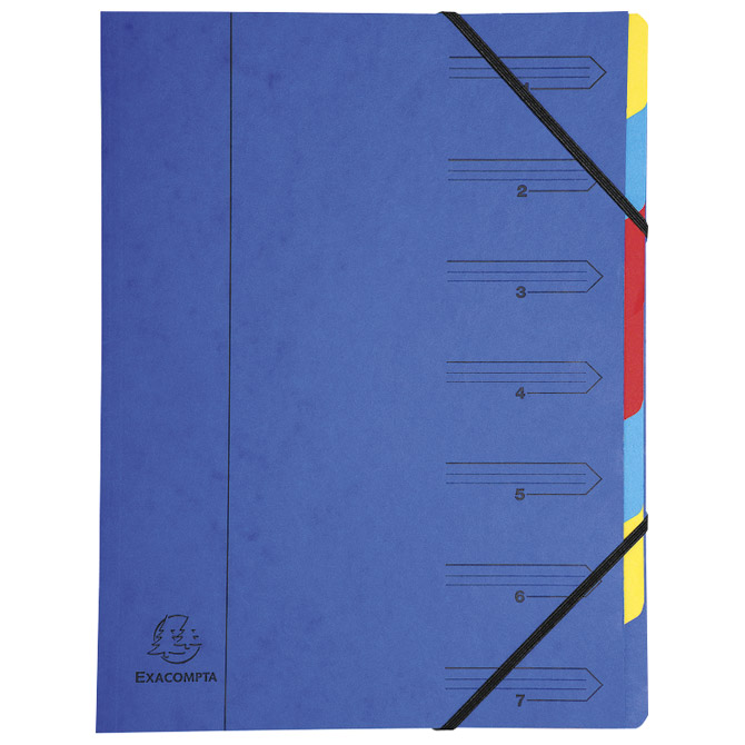 MAPA S PREGRADAMA ZA ODLAGANJE SPISA Marka: EXACOMPTA Detalji: 7; format: A4; dimenzija: 245×320 mm; karton: 400 g/m2; pregrade u boji; gumice na rubovima