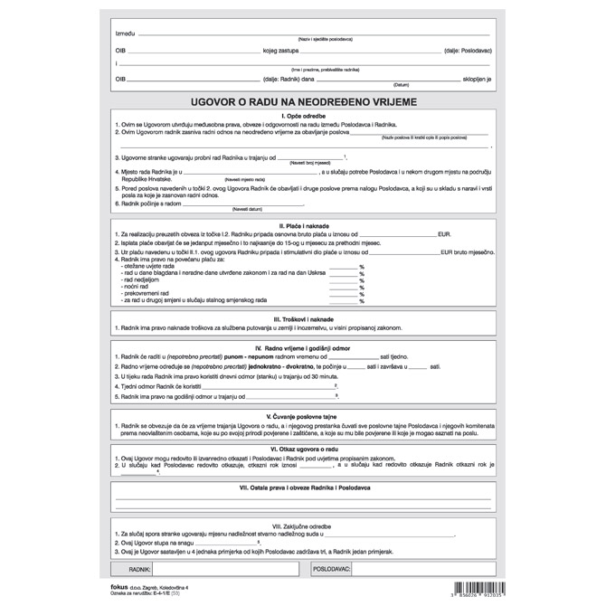 OBRAZAC – RADNI ODNOS Marka: FOKUS Detalji: E-4-1/E; ugovor o radu na neodređeno vrijeme; format : A4; lijepljeno u setovima 1+3;Kadrovski poslovi i plaće SKU: 000054455