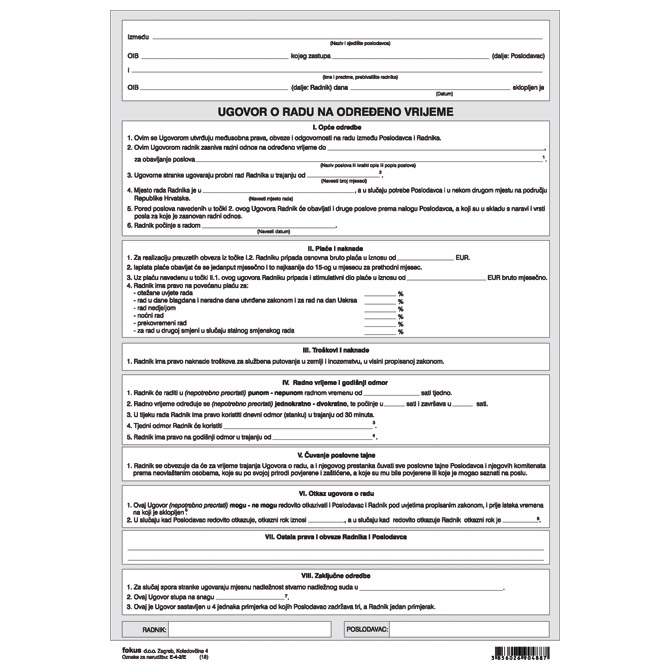 OBRAZAC – RADNI ODNOS Marka: FOKUS Detalji: E-4-2/E; ugovor o radu na određeno vrijeme; format : A4; lijepljeno u setovima 1+3;Kadrovski poslovi i plaće SKU: 000053346