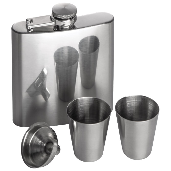 Detalji: ;nehrđajući čelik; s lijevkom i dvije čašice; sigurnosni čep; u kartonskoj poklon kutiji dimenzije: 18,8x17x4,4 cm