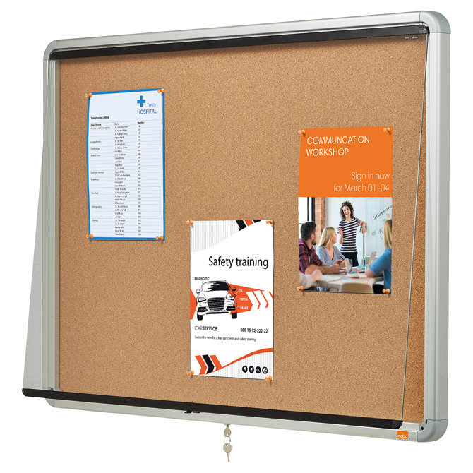 PLOČA OGLASNA PLUTO Marka: NOBO Detalji: ;dimenzija: 100×75,2×3,7 cm; za 9 x A4 dokumenta; može se koristiti unutar zatvorenih prostora; unutarnji prostor za korištenje: 16 mm; aluminijski okvir; staklena krilna vrata (4mm); set tipli i vijka za postavljanje na zid; mogućnost zaključavanja (2 ključa) SKU: 000024545