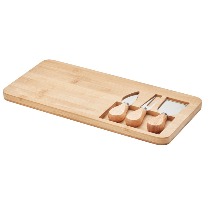 Detalji: ;izrađen od bambusa; sadrži 4 dijela: 2 noža za serviranje, vilica i daska za rezanje; dimenzija: 37,5×17,5×1,5 cm