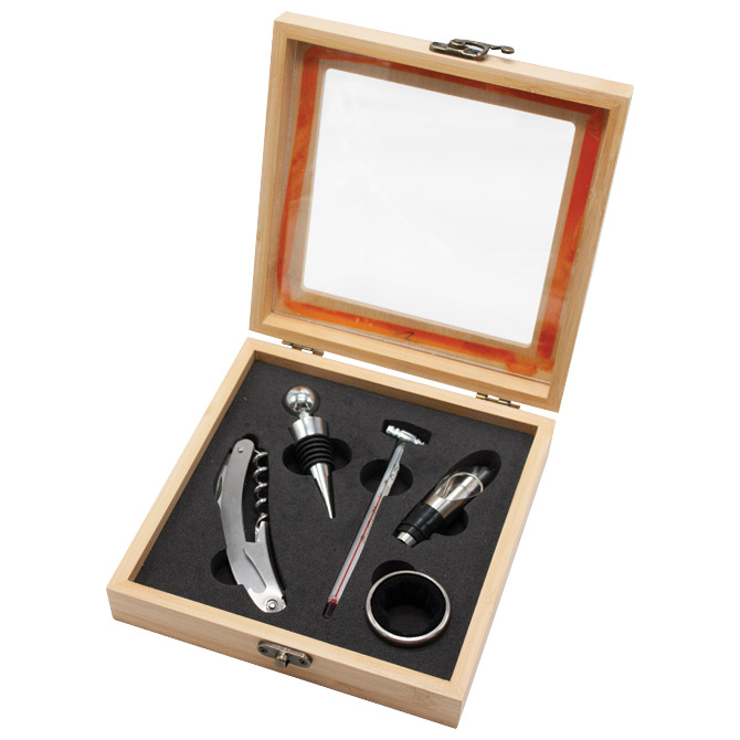 SET ZA VINO Marka: Detalji: ;5 dijelova; drvo bambus; poklopac proziran: 12,5×12,8 cm; dimenzija: 17,5×17,5 cm SKU: 000055593
