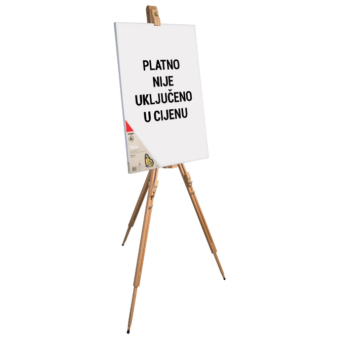 Detalji: ;drveni; dimenzija sklopljenog stalka: 14×90 cm; maksimalna visina platna je 125 cm; ima 3 nogice sa gumom na dnu; podesiva visina nogica koje reguliraju visinu stalka; jednostavno za sastavljanje; idealan za slikanje ili izlaganje radova; u kartonskoj kutiji