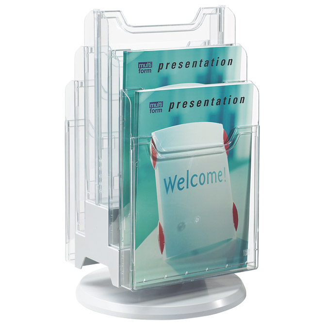 Detalji: ;dimenzija: 315×465 mm; 6 pretinaca za A4 brošure; dubina pretinca: 26 mm; rotirajući za 360°; čvrsta baza; okomit