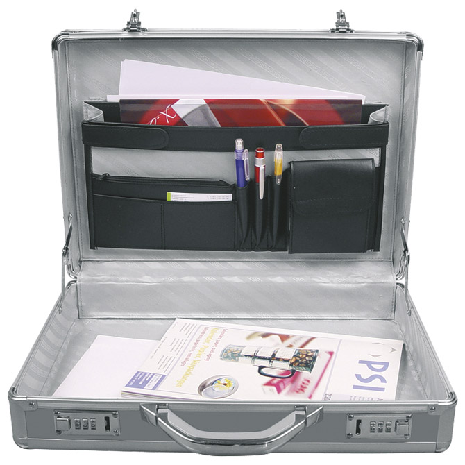 Detalji: ;aluminijska; s ručkom i 2 kopče na šifru; na gornjem poklopcu ima: 2 velika pretinca (na bočnim stranama se mogu pričvrstiti sa remenčićima na gumb), 2 mala pretinca, 1 džep na zip, 1 džep na gumb i mjesto za 3 olovke; ima 4 nogice za stabilnost; unutrašnja dimenzija: 32x45x10 cm; vanjska dimenzija: 34,5x46x12 cm; dimenzija prostora za 17″ prijenosno računalo (30x43x7 cm); težina: 2,4 kg