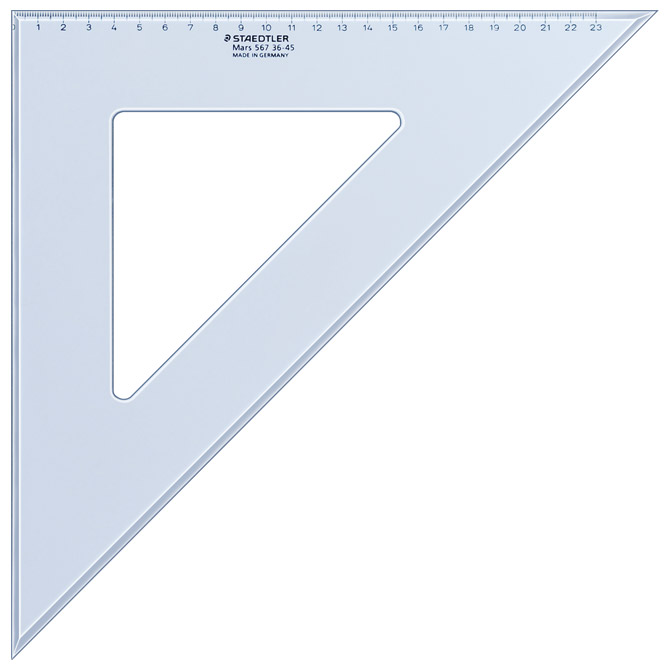 Detalji: 36 cm;jednakokračan (za crtanje sa kutovima 45°); PVC; sa mjernom skalom (podjela po 1 mm); počinje odmah na rubu mjerne strane; sa zaoštrenim rubom za precizniju upotrebu