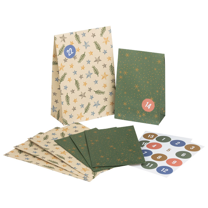 VREĆICE UKRASNE – BEZ RUČKI Marka: STEWO Detalji: ;papir od šećerne trske; dvije dimenzije: 12x16x24x8 cm, 12×12,5x19x6,5 cm; naljepnice brojevi 1-24 SKU: 000056831