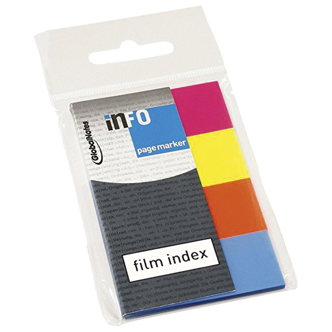 Detalji: narančasta, plava, roza i žuta;dimenzija: 20×50 mm; 4 boje x 40 zastavica; poliester; mogućnost višekratnog korištenja; za označavanje stranica i dokumenata; blister