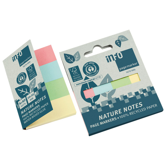 Detalji: ;dimenzija: 20×50 mm; 4 boje x 40 zastavica; papir; 4 boje: plava, roza, zelena i žuta; za označavanje stranica i dokumenata; mogućnost višestrukog premještanja; izrađen od 100 % recikliranog papira; ekološki prihvatljiv (Blue Angel certifikat); ljepilo je bez otapala izrađeno na bazi vode; u 100 % recikliranoj kartonskoj kutiji; blister